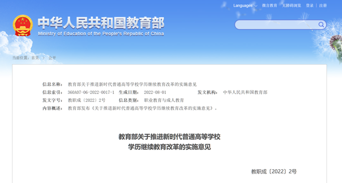 《教育部关于推进新时代普通高等学校学历继续教育改革的实施意见》近日印发,要求自2025年秋季起,高等学历继续教育不再使用“函授”“业余”的名称,统一为“非脱产”,主办高校可根据专业特点和学生需求等,灵活采取线上线下相结合形式教学。