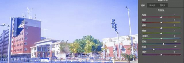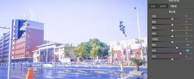 c. HSL灰度里面,色相中把洋红往紫色方向拉到底,蓝色也稍稍往紫色拉一点点;饱和度中,把蓝色和紫色的饱和度拉高;明亮度中,把蓝色和紫色的明亮度拉高,其他画面中的主体颜色也可以适当拉高。