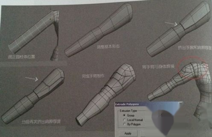 制作手臂,使用圆柱体模型,将圆柱体旋转到手臂位置,将手臂放置成“人”形,有利于以后的骨骼绑定,然后选择手臂上的边进行缩放,调整手臂的一般凹凸效果;选择手臂上的面,使用“挤出”命令挤出护甲的厚度,最后将手臂模型附加到身体上,并将连接的顶点焊接在一起,完成手臂的制作。